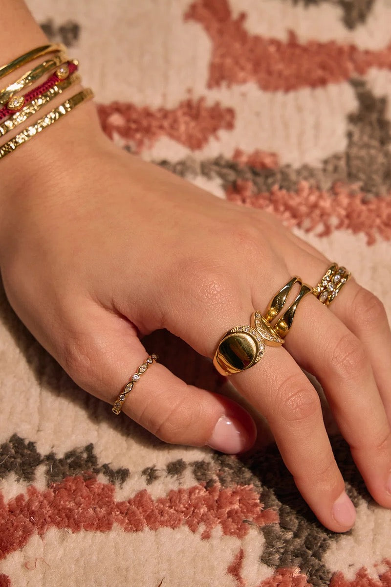 Make a statement with the Nash Gold Ring by ARMS OF EVE — a bold piece that radiates effortless style. Crafted from high-quality gold plating, this chunky yet refined ring is your go-to for stacking or wearing solo for maximum impact.