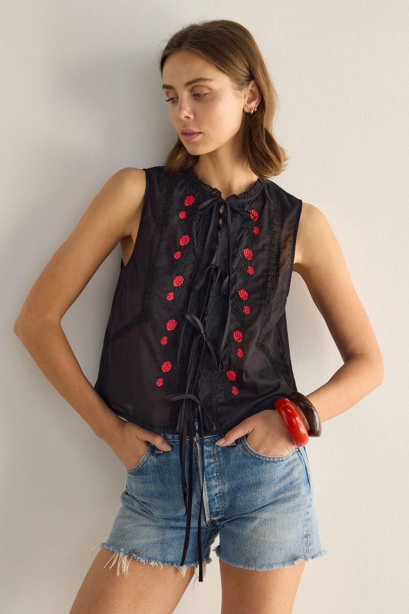 Meet the blouse that blends romance with effortless cool — the Bellamy Embroidered Blouse by AUGUSTE THE LABEL. Crafted in a lightweight black fabric, this sleeveless top features intricate lace paneling and beautifully embroidered red rose details that elevate its bohemian charm.