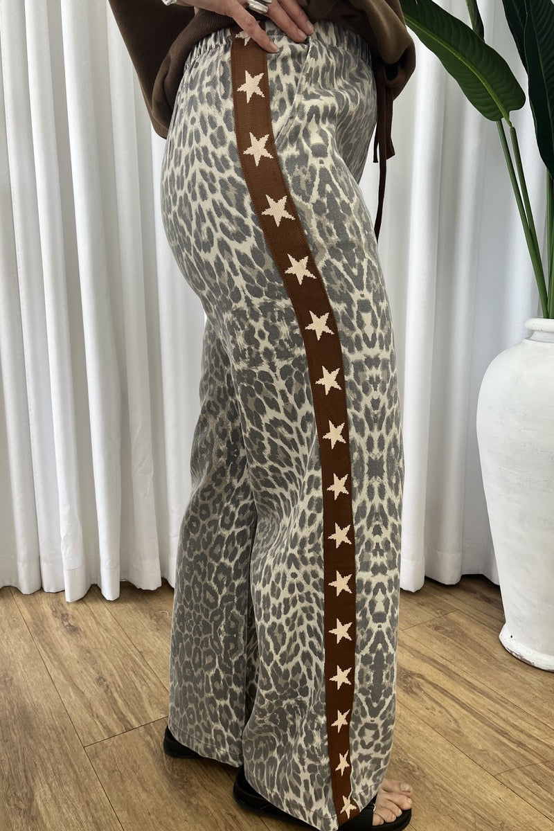 Make a wild statement in the BY FRANKIE Brown Leopard Racer Jean. These standout jeans feature a washed leopard print base with a bold brown star racer stripe down the sides for that sporty-chic edge. Designed with a relaxed wide-leg fit and an elasticated waist for all-day comfort, they’re perfect for off-duty days that still deserve a little attitude.