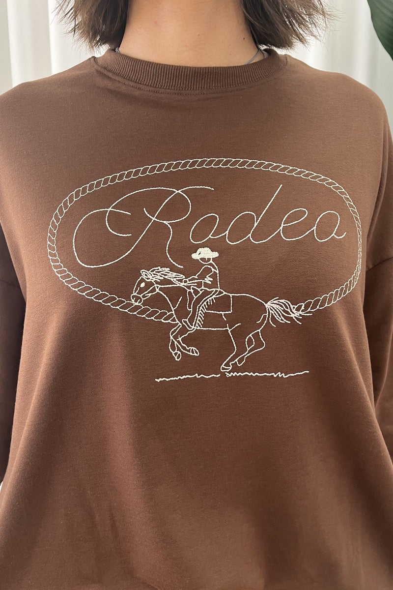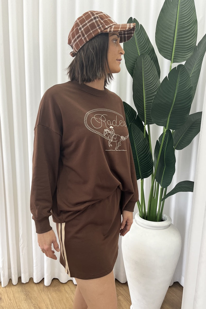 Channel casual Western vibes in the BY FRANKIE Choc Rodeo Long Sleeve Tee. Crafted from soft cotton in a rich chocolate hue, this oversized crewneck features a standout rodeo graphic with rope detailing and cowboy illustration across the chest. Designed for all-day comfort and effortless style, it’s perfect paired with denim, bike shorts, or the matching track skirt for the full Frankie look.