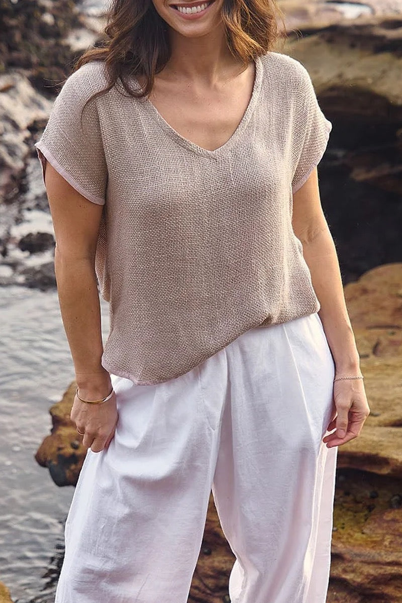 The Paris V Neck Hessian Top in Cinnamon features a relaxed silhouette complemented by a flattering V-neckline and comfortable short sleeves. Crafted for everyday ease, this top combines simplicity with artisanal appeal, making it a versatile addition to any wardrobe seeking understated elegance.