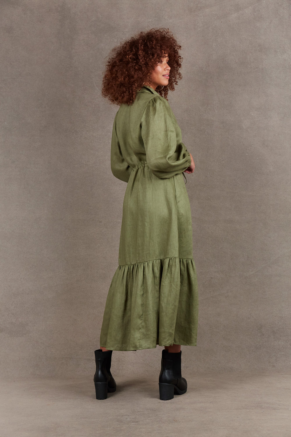 Indulge in the understated elegance of the 100% linen Nama Shirt Dress. With a classic collar, balloon sleeves, and a flowing tiered design, it exudes timeless charm. The waist drawstring creates a flattering cinched effect, making it suitable for any occasion, from casual outings to dressier affairs. Pair with boots and statement accessories for a fabulous look!