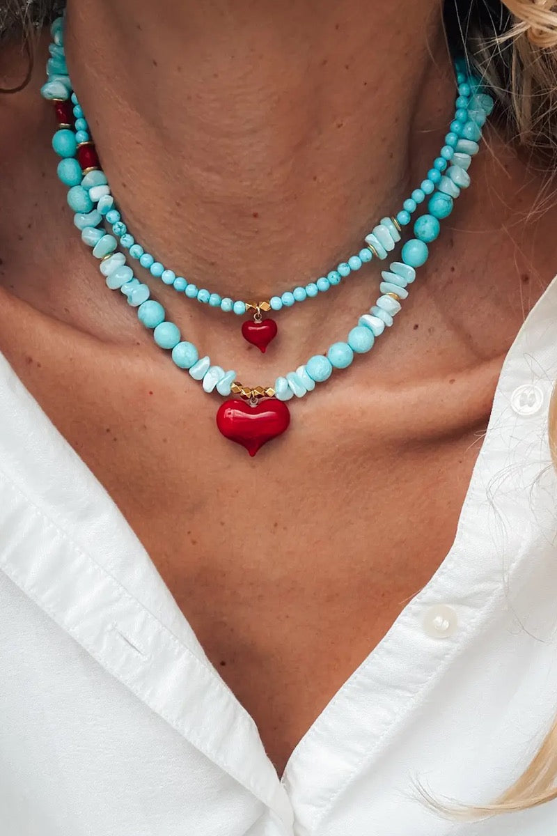 GOUPI Semiprecious Howlite Turquoise Beads Necklace with Big Red Heart