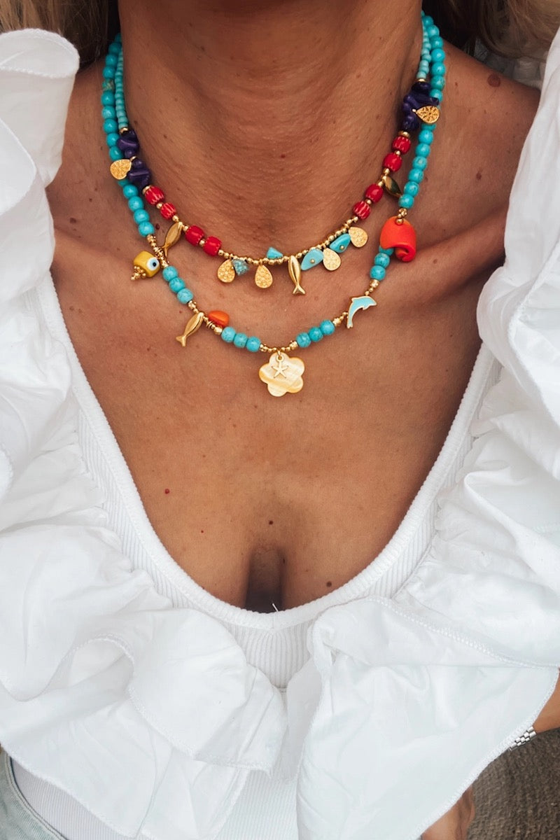 Bring a burst of summer colour to your look with the GOUPI Turquoise Semiprecious Beaded Summer Necklace – Yellow Flower. Crafted with vibrant turquoise semiprecious beads, this necklace is finished with a cheerful yellow flower charm that adds a playful, sun-kissed touch.