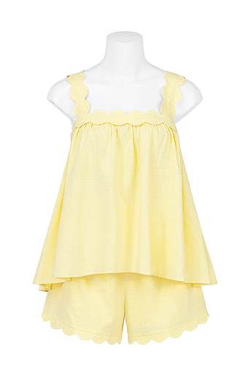 Sweet, soft, and sunshine-ready — the LENNI Lemon Top is made for warm days and effortless styling. Designed in a breezy, lightweight lemon-yellow fabric, this top features a relaxed swing silhouette with beautifully scalloped straps and hem detailing for a feminine, playful finish.