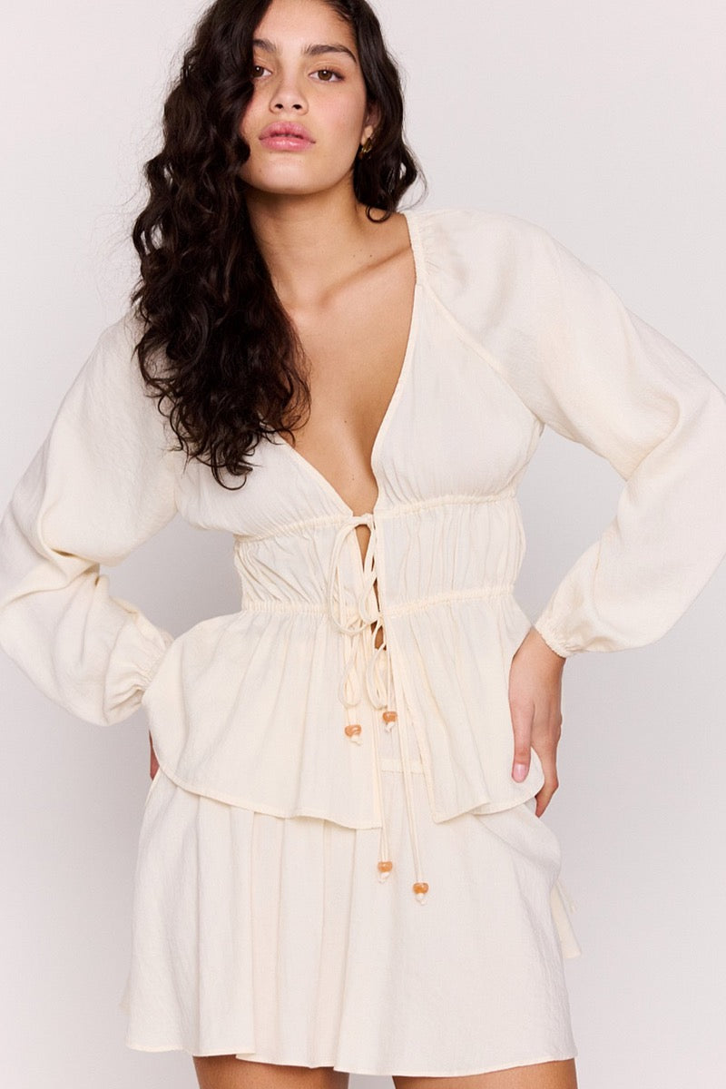 Soft, romantic, and effortlessly feminine, the Minkpink Estelle Tie Front Blouse in Cream brings delicate detail to everyday dressing. Designed with a flattering tie-front feature, this blouse creates subtle shape while maintaining an easy, relaxed feel. The soft cream tone enhances its versatility, making it perfect for both elevated daywear and refined evening styling. Light, graceful, and timeless, the Estelle Blouse is a wardrobe piece that blends modern femininity with effortless charm.
