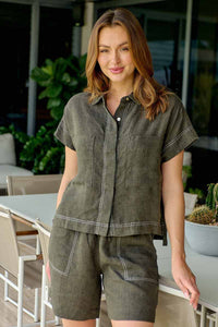 Great loose fitting linen short with tie waist and stitching detail. Looks great work with the matching top.