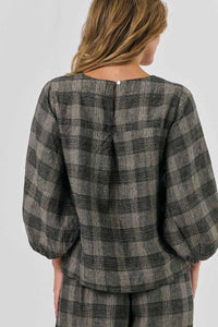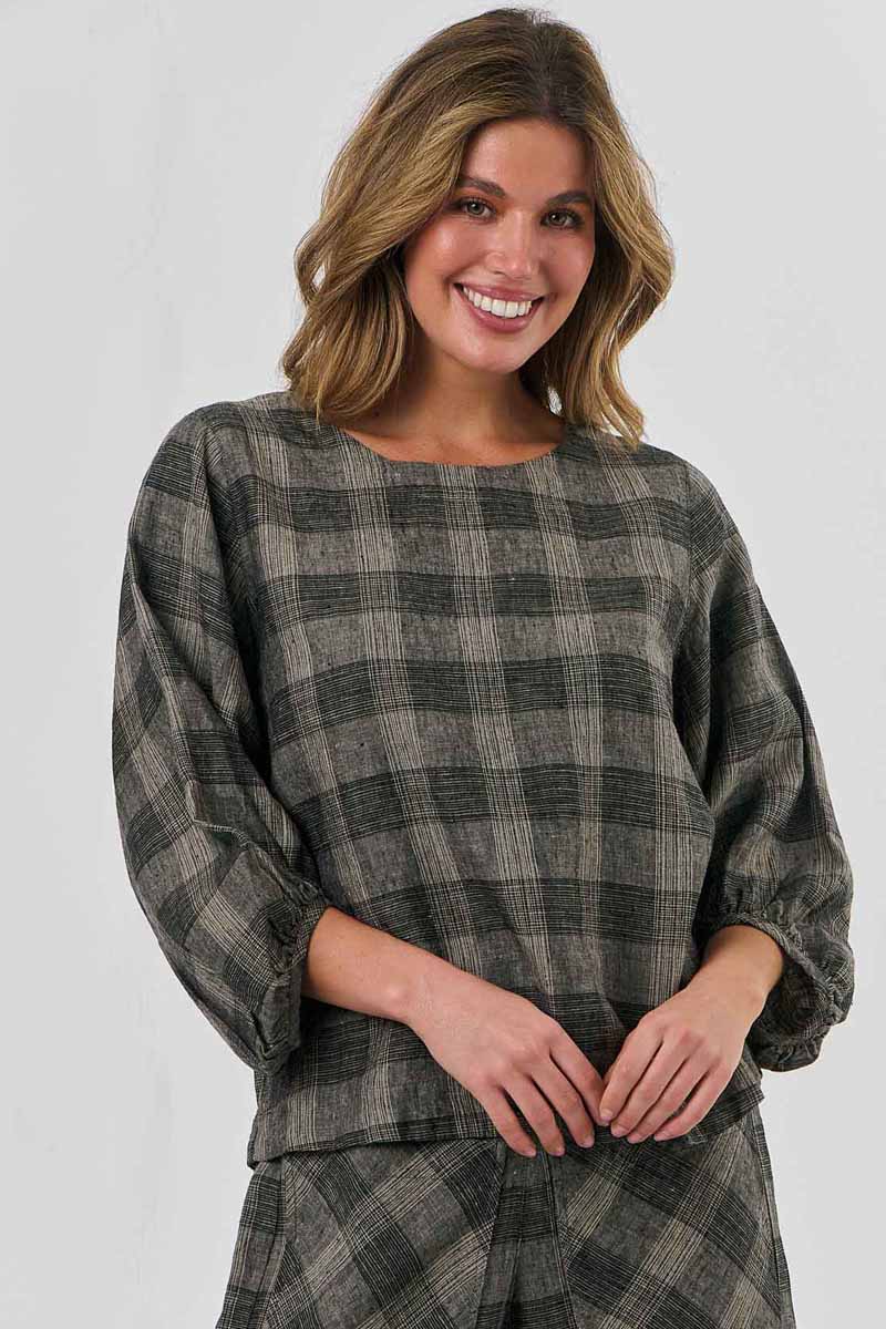 The elbow length bishop sleeves make the GA537 a stand-out piece. The wide trim around the round neck and hem of this top adds an element of charm. A single shell button closure and inverted box pleat on the back rounds out GA537. Made from 100% linen.