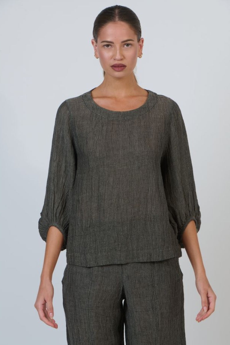 Elevate your wardrobe with the Naturals by O&J GA537 Top, crafted in luxurious 100% linen for effortless style and comfort. The elbow-length bishop sleeves create a soft, feminine silhouette, while the wide trim along the round neckline and hem adds understated charm. A single shell button closure and an inverted box pleat at the back give this top a touch of refined detail, making it perfect for both casual and smart-casual occasions.