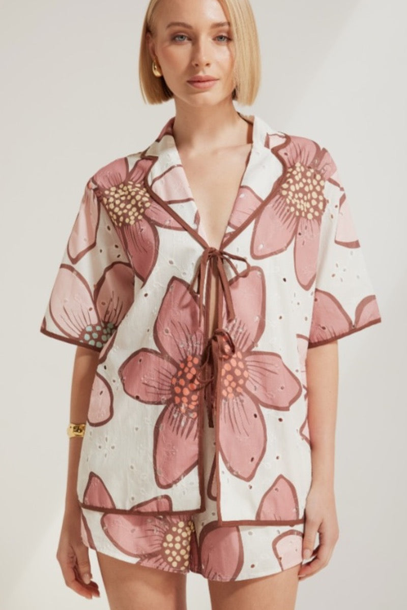 The Fellar Shirt by Rosebullet captures the essence of laid-back luxury with a bold floral twist. Featuring an oversized fit and crafted from a breathable cotton blend, this statement shirt showcases a stunning large-scale pink and white floral print contrasted with soft brown piping for an effortlessly chic finish.