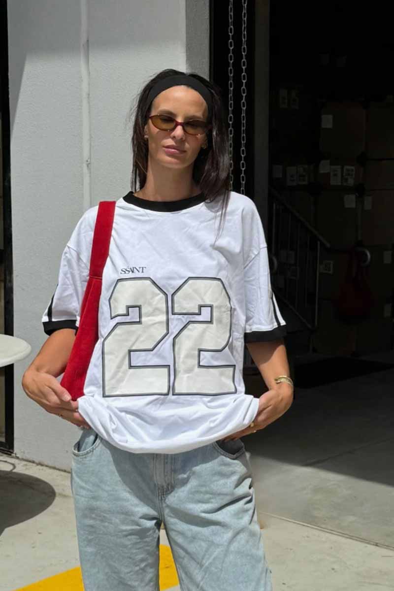 Introducing the Twenty Two Tee White, an oversized unisex design that pays tribute to our iconic Twenty Two fragrance. This bold white tee features 22 numbers on the front, complemented by black stripes on the shoulders and sleeves for a football jersey-inspired look. Effortlessly cool and unmistakably stylish, this tee is your ultimate statement piece.