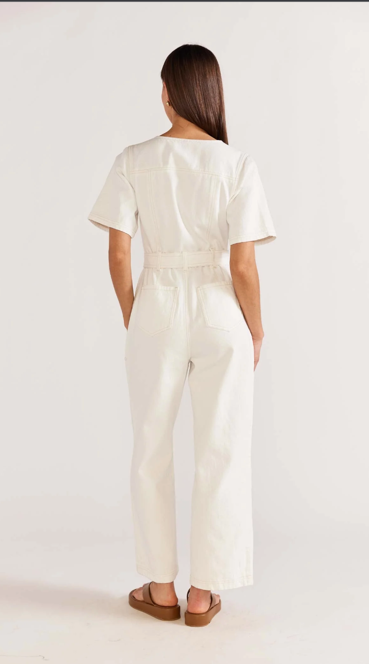 - Denim short sleeve jumpsuit with contrast stitching